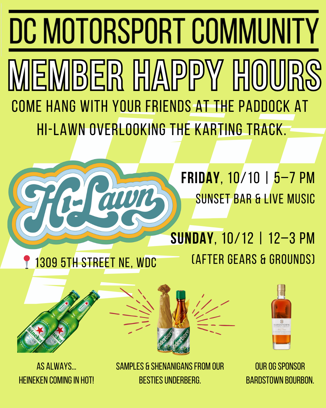 Spectators and DC Motorsports Community members can enjoy special happy hours on Friday (10/10, 5-7pm) featuring a sunset bar and live music, and Sunday (10/12, 12-3pm) with drink specials.